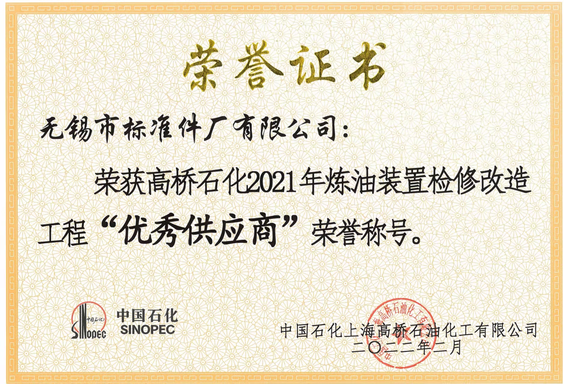 2021年度,我公司凭借优良的产品性能、稳定的产品质量、准时的交付周期、优质的售后服务,荣获中国石化上海高桥石油化工有限公司颁发的“优秀供应商”奖牌及荣誉证书。此次获得该殊荣,充分体现了客户对我公司的认可和肯定。